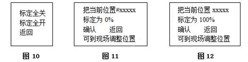 4.7.3.4全關(guān)標(biāo)定如(圖10):進(jìn)入標(biāo)定全關(guān),將閥門關(guān)到全關(guān)位置標(biāo)定為0%、xxxxx處顯示編碼器檢測(cè)到的開度^值數(shù)(0~65535)在此界面下,光標(biāo)在確認(rèn)處按下設(shè)置確定鍵,即成功把當(dāng)前位置標(biāo)定為全關(guān)位置,顯示比例0%;光標(biāo)在返回處按下設(shè)置確定鍵如(圖11)所示,直接返回到上級(jí)菜單。