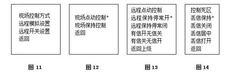 A) 現(xiàn)場(chǎng)控制方式如(圖 12):現(xiàn)場(chǎng)控制方式可選擇點(diǎn)動(dòng)或自保持兩種模式如(圖 12)。通過操作旋鈕的打開操作,可移動(dòng)光標(biāo)位置。在光標(biāo)停留選項(xiàng)上,通過操作旋鈕的關(guān)閉操作,確認(rèn)選中該選項(xiàng)。被選中的選項(xiàng),將被標(biāo)注“*”