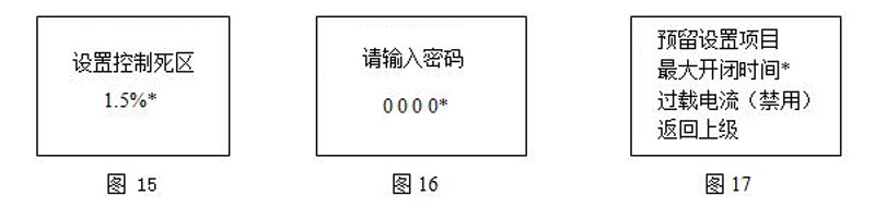 若配置調(diào)節(jié)型主控板,設(shè)置菜單如(圖14)所示:通過操作旋鈕的打開操作,可移動(dòng)光標(biāo)位置。在光標(biāo)停留選項(xiàng)上,通過操作旋鈕的關(guān)閉操作,可選中該選項(xiàng)。被選中的選項(xiàng),將被標(biāo)注“*”若光標(biāo)在控制死區(qū)位置按下確認(rèn)鍵,可進(jìn)入控制死區(qū)的設(shè)置如圖(圖15),控制死區(qū)決定調(diào)節(jié)型閥門的控制精度,可在“自適應(yīng)-0.5%-10.0%之間調(diào)整”。調(diào)整時(shí)考慮閥門慣沖量等因素不可設(shè)置過低的死區(qū)值,以免引起閥門震蕩,推薦控制死區(qū)1.5%-2.5%。