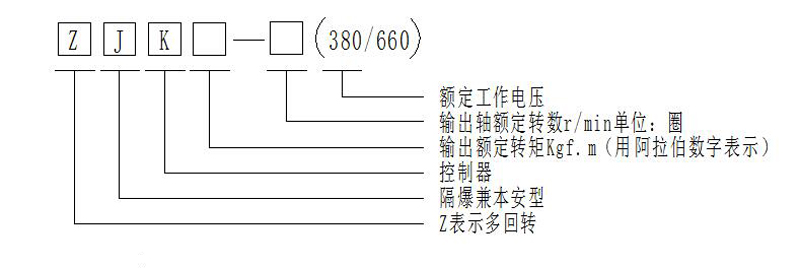 ZJK45/24(660):表示多回轉(zhuǎn)、隔爆兼本安型、輸出轉(zhuǎn)矩450N?m(45kgf?m)、輸出轉(zhuǎn)速24 r/min,額定工作電壓為660或380V的電動(dòng)裝置。