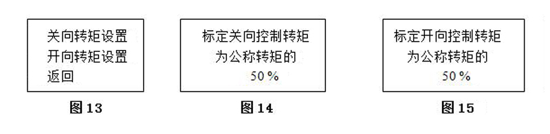 4.7.3.5關(guān)向轉(zhuǎn)矩設(shè)置如(圖13):進(jìn)入關(guān)向轉(zhuǎn)矩設(shè)置,可設(shè)置關(guān)向控制轉(zhuǎn)矩大小。閥門(mén)關(guān)閉過(guò)程中,檢測(cè)到關(guān)向轉(zhuǎn)矩超過(guò)設(shè)定的控制轉(zhuǎn)矩時(shí)執(zhí)行關(guān)向過(guò)矩保護(hù)。控制轉(zhuǎn)矩可調(diào)整范圍30%~120%在此界面下,旋轉(zhuǎn)操作扭增加、減少可在30%~120%之間調(diào)整數(shù)值如(圖14)。調(diào)整完成后,把光標(biāo)移動(dòng)到返回項(xiàng)按下設(shè)置確定鍵保存并返回上級(jí)界面。