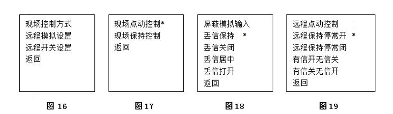4.7.3.8現(xiàn)場(chǎng)控制方式如(圖16):現(xiàn)場(chǎng)控制方式可選擇點(diǎn)動(dòng)或自保持兩種模式如(圖17)。通過(guò)操作旋鈕的打開(kāi)操作,可移動(dòng)光標(biāo)位置。在光標(biāo)停留選項(xiàng)上,通過(guò)操作旋鈕的關(guān)閉操作,確認(rèn)選中該選項(xiàng)。被選中的選項(xiàng),將被標(biāo)注“*”