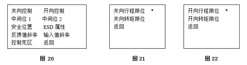 4.7.3.12關(guān)向控制設(shè)置如(圖21):該子菜單可設(shè)置關(guān)向限位形式選擇行程限位,由編碼器位置進(jìn)行限位,當(dāng)開(kāi)度到0%時(shí)輸出關(guān)限位標(biāo)志,禁止電動(dòng)裝置關(guān)向操作;選擇轉(zhuǎn)矩限位,由轉(zhuǎn)矩電位器信號(hào)限位,當(dāng)閥門(mén)關(guān)閉過(guò)程中檢測(cè)到當(dāng)前轉(zhuǎn)矩大于設(shè)定的控制轉(zhuǎn)矩時(shí),輸出關(guān)限位標(biāo)志,禁止電動(dòng)裝置關(guān)向操作。
