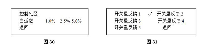 4.7.3.20 控制死區(qū)設(shè)置如(圖29):控制死區(qū)為調(diào)節(jié)型控制時(shí)響應(yīng)輸入目標(biāo)開(kāi)度的死區(qū)范圍,可進(jìn)入子菜單設(shè)置1.0%、2.5%、5.0%三個(gè)選項(xiàng)。
