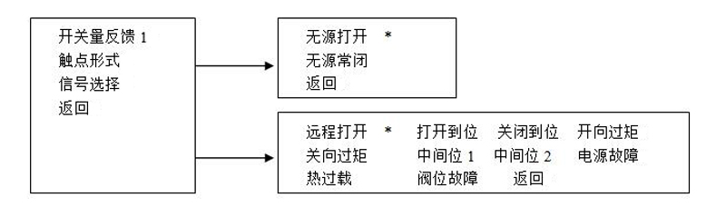 4.7.3.13開(kāi)向控制設(shè)置如(圖22):該子菜單可設(shè)置關(guān)向限位形式選擇行程限位,由編碼器位置進(jìn)行限位,當(dāng)開(kāi)度到100%時(shí)輸出開(kāi)限位標(biāo)志,禁止電動(dòng)裝置開(kāi)向操作;選擇轉(zhuǎn)矩限位,由轉(zhuǎn)矩電位器信號(hào)限位,當(dāng)閥門(mén)打開(kāi)過(guò)程中檢測(cè)到當(dāng)前轉(zhuǎn)矩大于設(shè)定的控制轉(zhuǎn)矩時(shí),輸出開(kāi)限位標(biāo)志,禁止電動(dòng)裝置開(kāi)向操作。